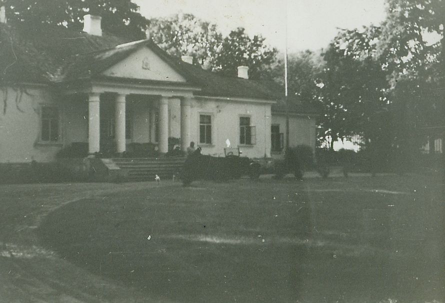 | Nr. inwentarzowy: MŁJ-XVI 1747 / 00 / 100 opis: Dwór Bohdanowiczów w Stajkach. Nawiązujący do klasycyzmu, parterowy dom wzniesiony na planie czworokąta i przykryty dachem gontowym. Z przodu taras z portykiem o 4 kolumnach z trójkątnym szczytem (z herbem Bohdanowiczów). Dom otoczony parkiem, na pierwszym planie okrągły gazon. Obok schodów na taras stoi samochód.czas powstania - daty graniczne: 1938-08-01 - 1938-08-31miejsce: Stajki - majątek Bohdanowiczów, obecnie wieś na Białorusi w rejonie wilejskim, obwodu mińskiegotworzywo: papier fotograficzny, błyszczącytechnika: odbitka żelatynowo-srebrowa DOP, czarno-białazespół: album rodziny Leskichwymiary (wys. x szer.): 56 x 82 [mm]