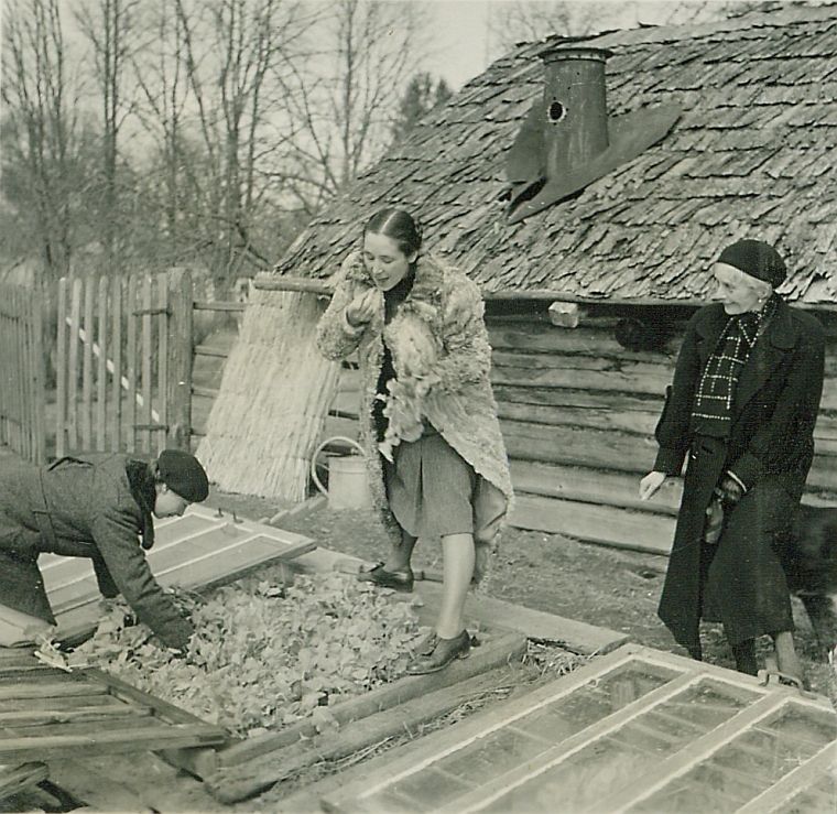 | Nr. inwentarzowy: MŁJ-XVI 1747 / 00 / 038 opis: Wielkanoc. Zbieranie w inspektach Krysi [Krystyny Bohdanowicz] rzodkiewek do obiadu. Od lewej: Krystyna Bohdanowicz, Wanda Bohdanowicz, Katarzyna Cywińska.czas powstania - daty graniczne: 1938-04-17 - 1938-04-17miejsce: Stajki - majątek Bohdanowiczów, obecnie wieś na Białorusi w rejonie wilejskim, obwodu mińskiegoosoby: Krystyna Bohdanowicz - siostra Michała Bohdanowicza; Wanda Bohdanowicz zd. Leska - żona rtm. Michała Bohdanowicza; Katarzyna Cywińska - nazywana ciocią, prawdopodobnie rodzina Marii Bohdanowicz z Cywińskich, matki Michała, Krystyny i Heleny.tworzywo: papier fotograficzny, błyszczącytechnika: odbitka żelatynowo-srebrowa DOP, czarno-białazespół: album rodziny Leskichwymiary (wys. x szer.): 60 x 62 [mm]