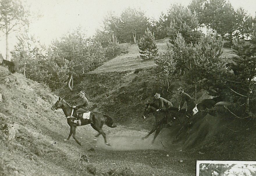 | Nr. inwentarzowy: MŁJ-XVI 1747 / 00 / 060 opis: Okolice toru wyścigów konnych - wojskowy bieg na przełaj im. 13 Pułku Ułanów Wileńskich. Porośnięty sosnami wąwóz pokonuje trzech oficerów.czas powstania - daty graniczne: 1938-06-12 - 1938-06-26miejsce: Wilno, Pośpieszkatworzywo: papier fotograficzny, błyszczącytechnika: odbitka żelatynowo-srebrowa DOP, czarno-białazespół: album rodziny Leskichwymiary (wys. x szer.): 58 x 83 [mm]