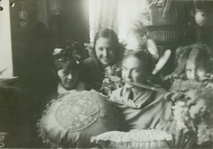 | Nr. inwentarzowy: MŁJ-XVI 1744 / 00 / 023 opis: W ciemnym pokoju siedzą(?) i leżą(?) 4 młode kobiety - widać głównie głowy: Irène, Wanda Leska, Anna Leska [Anka] i Janina Kotlińska. Anna Leska trzyma w zębach nóż - maczetę? Na pierwszym planie haftowane poduszki. W głębi okno.czas powstania - daty graniczne: 1931-01-01 - 1931-01-31miejsce: Warszawaosoby: od lewej: Irène; Wanda Leska (1908-1991); Anna Leska (1910-1998); Janina Kotlińska 1907-1989 („Nina”, "Ninon", córka Kazimierza i Eugenii zd. Grudzińskiej, siostra Edmunda)tworzywo: papier fotograficzny, błyszczącytechnika: odbitka żelatynowo-srebrowa DOP, czarno-białazespół: album rodziny Leskichwymiary (wys. x szer.): 86 x 106 [mm]