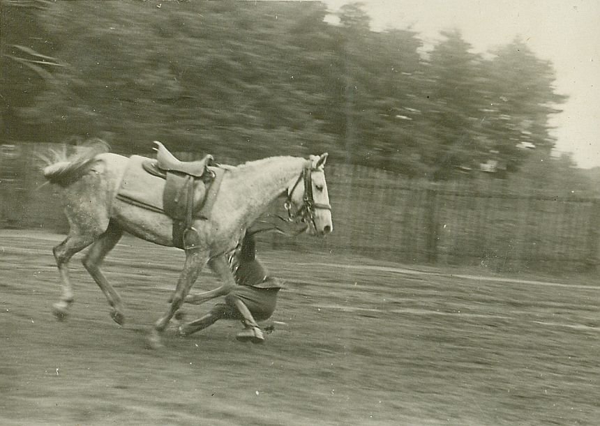 | Nr. inwentarzowy: MŁJ-XVI 1747 / 00 / 006 opis: Bieg św. Huberta Wileńskiej Brygady Kawalerii – upadek. Z siwego konia w wojskowym rzędzie spada jeździec w mundurze.czas powstania - daty graniczne: 1937-10-17 - 1937-10-17miejsce: Wilno, Pośpieszka.inne nazwy własne: 3 SBK, 3 Samodzielnej Brygady Kawalerii (zmiana nazwy 1 kwietnia 1937)tworzywo: papier fotograficzny, błyszczącytechnika: odbitka żelatynowo-srebrowa DOP, czarno-białazespół: album rodziny Leskichwymiary (wys. x szer.): 59 x 82 [mm]