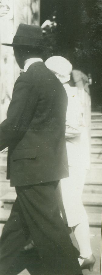 | Nr. inwentarzowy: MŁJ-XVI 1743 / 00 / 030 opis: Obok schodów przechodzą: por. Michał Bohdanowicz w ciemnym stroju cywilnym (kapelusz, garnitur) oraz Janina Kotlińska w jasnym stroju (kapelusik, garsonka).data: Zdjęcie z 1930 r., ciepła pora roku, prawdopodobnie czerwiec - okres trwania Międzynarodowych Zawodów Konnych w Łazienkach.czas powstania - daty graniczne: 1930-03-01 - 1930-10-31miejsce: Warszawa, być może Łazienkiosoby: por. Michał Bohdanowicz (1903-1948) 9 p.s.k., Janina Kotlińska ("Ninon", "Nina")tworzywo: papier fotograficzny, błyszczącytechnika: odbitka żelatynowo-srebrowa DOP, czarno-białazespół: album rodziny Leskichwymiary (wys. x szer.): 112 x 46 [mm]