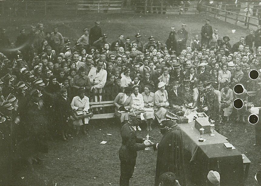 | Nr. inwentarzowy: MŁJ-XVI 1747 / 00 / 088 opis: Tor wyścigów konnych - wojskowa gonitwa z przeszkodami Budsławia (dawniej miasteczko, obecnie wieś na Białorusi w rejonie miadziolskim). Rtm. Michał Bohdanowicz, po wygraniu gonitwy na klaczy Pilica, odbiera z rąk gen. Rudolfa Dreszera nagrodę Budsławia. Z prawej stoły z nagrodami, w tle publiczność - wojskowi i cywile.czas powstania - daty graniczne: 1938-06-23 - 1938-06-23miejsce: Wilno, Pośpieszkaosoby: Rtm. Michał Bohdanowicz (1903-1948). Syn Jana i Marii z Cywińskich. W latach 1932-36 i przed II wojną służył w 4 p.u., od 1936 w 13 p.u. jako dowódca 1 szwadronu "Tatarskiego" (do 15.05.1938); gen. Rudolf Dreszer (dow. Wileńskiej BK w l. 1937-1939).tworzywo: papier fotograficzny, błyszczącytechnika: odbitka żelatynowo-srebrowa DOP, czarno-białazespół: album rodziny Leskichwymiary (wys. x szer.): 61 x 84 [mm] Koń: 1. Pilica, klacz - Harlekin - Brama, hod. K. Czermiński, wł. W. Wojtowicz. Koń, na którym rtm. M. Bohdanowicz startował w 1938 r. w gonitwach w Wilnie-Pośpieszce, na zdjęciu: niewidoczna, I miejsce