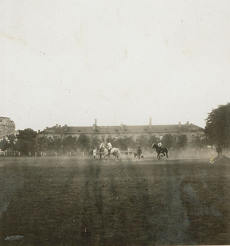 | Nr. inwentarzowy: MŁJ-XVI 1744 / 00 / 084 opis: Ttrening amazonek przed konkursami. Na dużym placu z przeszkodami jeżdżą konno amazonki w strojach treningowych. Wyraźniej widać 2 kobiety w kłusie - jedna na siwku, druga na koniu ciemnej maści, z odmianą na głowie. Na placu inne osoby - konno i pieszo. W głębi budynki, m.in. b. cerkiew.data: liście na drzewach - nie jest to zimaczas powstania - daty graniczne: 1931-03-01 - 1931-10-31miejsce: Warszawa, ujeżdżalnia 1 Dywizjonu Artylerii Konnej.inne nazwy własne: 1 DAK, 1 D.A.K., 1 Dywizjon Artylerii Konnejtworzywo: papier fotograficzny, błyszczącytechnika: odbitka żelatynowo-srebrowa DOP, czarno-białazespół: album rodziny Leskichwymiary (wys. x szer.): 60 x 57 [mm]