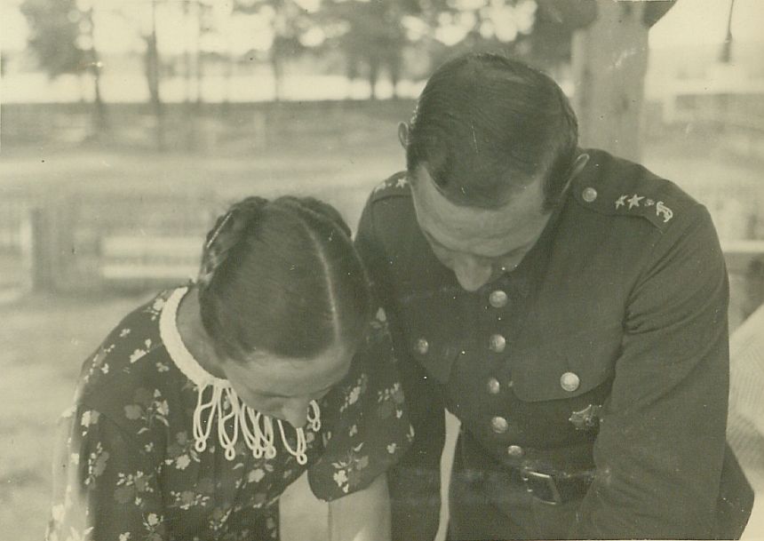 | Nr. inwentarzowy: MŁJ-XVI 1746 / 00 / 042 opis: Tor wyścigów konnych. "Narada wojenna" - Wanda Bohdanowicz i Antoni Żelewski stoją pochyleni i nad czymś debatują. W. Bohdanowicz w sukience z koronkowym kołnierzykiem, A. Żelewski w mundurze, bez czapki. Tło nieostre. data: jeden z dni wyścigowych - 2 lub 5 lipca 1936 r.czas powstania - daty graniczne: 1936-07-02 - 1936-07-05miejsce: Wilno, Pośpieszka.osoby: Wanda Bohdanowicz zd. Leska (1908-1991), córka Juliusza Leskiego i Marii zd. Olszyńskiej, żona Michała Bohdanowicza. Por. Antoni Żelewski (1905-1994), 8 p.u., jeździec klasy międzynarodowej, instruktor.tworzywo: papier fotograficzny, błyszczącytechnika: odbitka żelatynowo-srebrowa DOP, czarno-białazespół: album rodziny Leskichwymiary (wys. x szer.): 59 x 83 [mm]