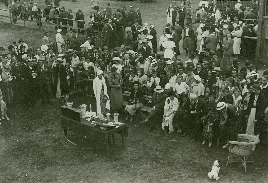 | Nr. inwentarzowy: MŁJ-XVI 1746 / 00 / 054 opis: Tor wyścigów konnych, przed rozdaniem nagród. Na placu obok toru stoi stół z przygotowanymi nagrodami (puchary, przedmioty artystyczne). Wokół tłum wyścigowych bywalców: kobiety, cywile, wojskowi, dzieci - stoją, siedzą na ławkach i ogrodzeniu. Przy wiklinowym fotelu pies Kimi.czas powstania - daty graniczne: 1936-06-28 - 1936-07-09miejsce: Wilno, Pośpieszka.tworzywo: papier fotograficzny, błyszczącytechnika: odbitka żelatynowo-srebrowa DOP, czarno-białazespół: album rodziny Leskichwymiary (wys. x szer.): 87 x 125 [mm]
