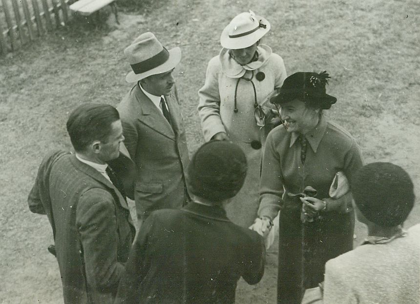 | Nr. inwentarzowy: MŁJ-XVI 1746 / 00 / 098 opis: Tor wyścigów konnych, po Steeple-chase im. Wojewody Wileńskiego Płk. Ludwika Bociańskiego. Na trawie stoi, rozmawia 6 osób - kobiety i cywile. W głębi, w jasnym płaszczu i kapeluszu Wanda Bohdanowicz. Z kobietą w ciemnym płaszczu i kapeluszu wita się Zofia Dobrzańska (ciemny kapelusz, bluzka, pod pachą jasna torebka).czas powstania - daty graniczne: 1936-07-16 - 1936-07-16miejsce: Wilno, Pośpieszka.osoby: Wanda Bohdanowicz zd. Leska (1908-1991), córka Juliusza Leskiego i Marii zd. Olszyńskiej, żona Michała Bohdanowicza. Zofia Dobrzańska (1909-1989), zd. Zakrzeńska, żona mjra Henryka Dobrzańskiego w latach 1932-1937, s.v. Zwierkowska.tworzywo: papier fotograficzny, błyszczącytechnika: odbitka żelatynowo-srebrowa DOP, czarno-białazespół: album rodziny Leskichwymiary (wys. x szer.): 83 x 115 [mm]
