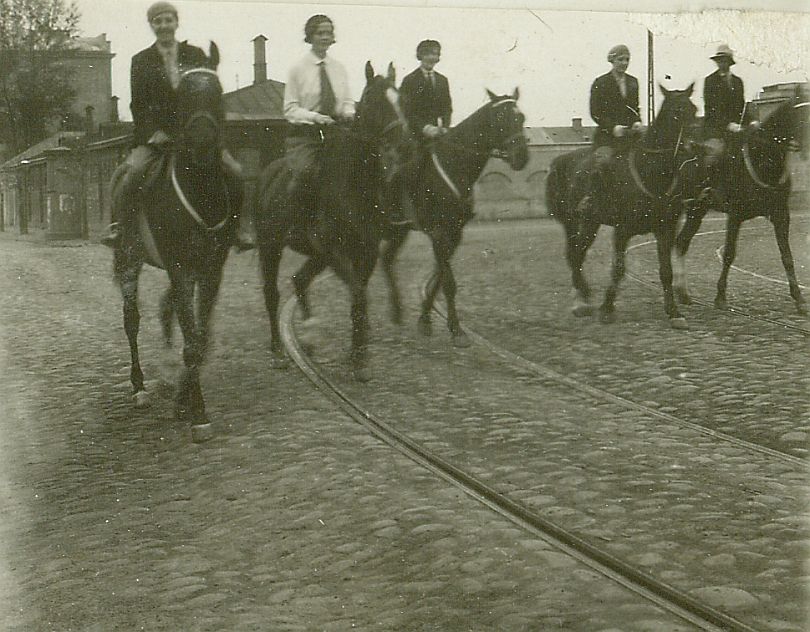 | Nr. inwentarzowy: MŁJ-XVI 1744 / 00 / 048 opis: Przed wyjazdem w teren. Brukowana ulica ze skręcającymi szynami. 5 kobiet na koniach ciemnej maści. Jadą stępem w stronę widza. Konie w rzędach sportowych, 4 z napierśnikami. Amazonki w strojach treningowych, 4 w beretach, 1 w kapeluszu. Pierwsza i czwarta od lewej - siostry Leskie. Z tyłu budynki.czas powstania - daty graniczne: 1931-05-01 - 1931-05-31miejsce: Warszawaosoby: Anna i Wanda Leskie - pierwsza i czwarta od lewej (w jasnych beretach)tworzywo: papier fotograficzny, błyszczącytechnika: odbitka żelatynowo-srebrowa DOP, czarno-białazespół: album rodziny Leskichwymiary (wys. x szer.): 53 x 57 [mm]
