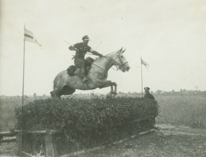 | Nr. inwentarzowy: MŁJ-XVI 1743 / 00 / 046 opis: Steepl, oficer w skoku na siwym koniu przez przeszkodę (szeroka hyrda z płotkiem - wskazówką). Widok z boku/przodu. Przeszkoda ograniczona proporczykami, przy niej żołnierz. Stroczony rząd oficerski.czas powstania - daty graniczne: 1930-07-01 - 1930-07-31miejsce: Warszawa, Moczydłoinne nazwy własne: Zawody Konne o Mistrzostwo Armjitworzywo: papier fotograficzny, błyszczącytechnika: odbitka żelatynowo-srebrowa DOP, czarno-białazespół: album rodziny Leskichwymiary (wys. x szer.): 87 x 110 [mm]