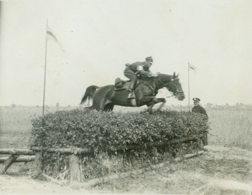 | Nr. inwentarzowy: MŁJ-XVI 1743 / 00 / 045 opis: Steepl, por. Władysław Zgorzelski w skoku na koniu Rinaldo przez przeszkodę (szeroka hyrda z płotkiem - wskazówką). Widok z przodu, z ukosa. Przeszkoda ograniczona proporczykami, przy niej żołnierz. Stroczony rząd oficerski.czas powstania - daty graniczne: 1930-07-01 - 1930-07-31miejsce: Warszawa, Moczydłoosoby: Por. Władysław Zgorzelski (1901-1998) 15 p.u. W 1929 r. tytuł Mistrza Armii na Rinaldo ind. i zesp., w 1930 r. tytuł Mistrza Armii na koniu Rinaldo - zespołowo.inne nazwy własne: Zawody Konne o Mistrzostwo Armjitworzywo: papier fotograficzny, błyszczącytechnika: odbitka żelatynowo-srebrowa DOP, czarno-białazespół: album rodziny Leskichwymiary (wys. x szer.): 87 x 113 [mm] Koń: 1. Rinaldo - W 1929 r. pod. Wł. Zgorzelskim mistrzostwo Armii ind. i zespołowo, w 1930 r. zespołowo