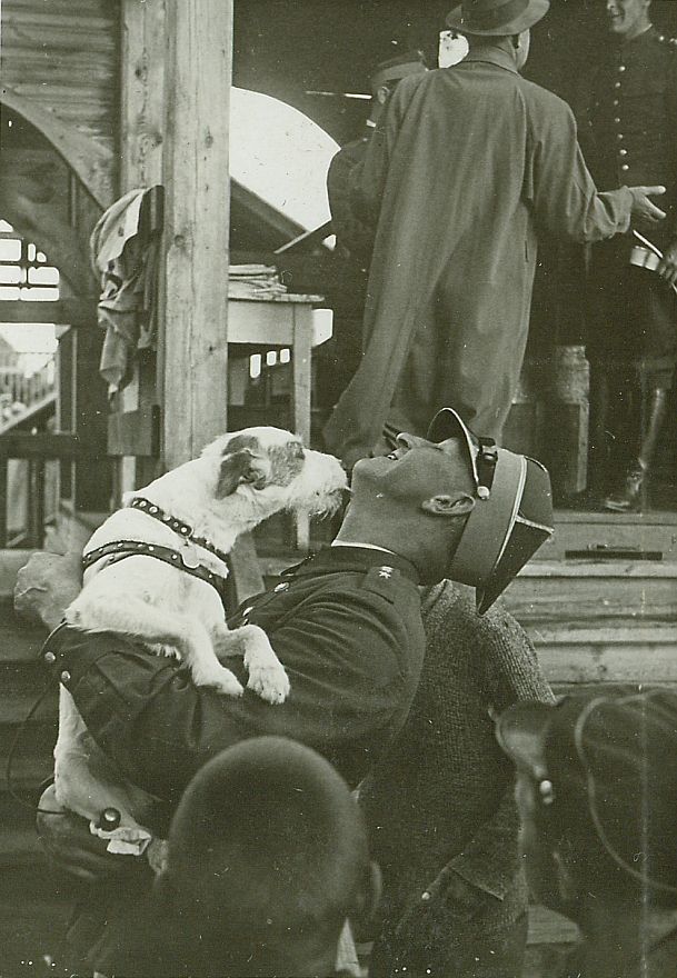 | Nr. inwentarzowy: MŁJ-XVI 1747 / 00 / 059 opis: Tor wyścigów konnych - po wojskowej gonitwie z przeszkodami im. K.O.P. Rokitno. Rtm. Michał Bohdanowicz z liżącym go po twarzy psem Kimi (jack russell terrier?) na rękach. Rotmistrz stoi przy schodach trybuny. Opis z albumu: "Kimi" winszuje Misiowi wygrania wyścigu.czas powstania - daty graniczne: 1938-06-16 - 1938-06-16miejsce: Wilno, Pośpieszkaosoby: Rtm. Michał Bohdanowicz (1903-1948), od 1936 w 13 Pułku Ułanów Wileńskich, do 15.05.1938 dowódca 1 szwadronu "Tatarskiego".tworzywo: papier fotograficzny, błyszczącytechnika: odbitka żelatynowo-srebrowa DOP, czarno-białazespół: album rodziny Leskichwymiary (wys. x szer.): 83 x 59 [mm]