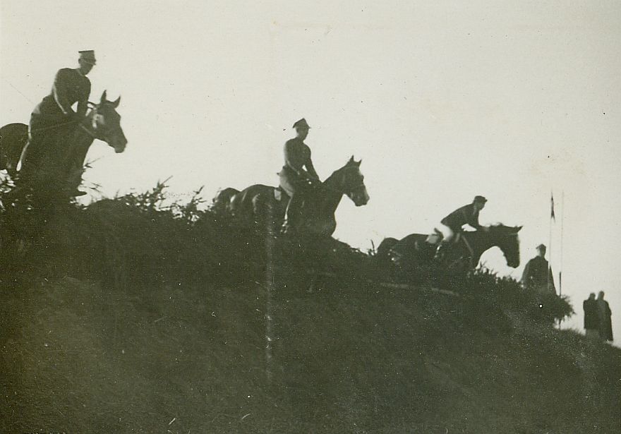 | Nr. inwentarzowy: MŁJ-XVI 1747 / 00 / 010 opis: Bieg św. Huberta w 13 p.u. – dwóch oficerów i kobieta pokonują konno przeszkodę terenową - zeskok prze hyrdę. Kobieta to ubrana w ciemny frak i jasne bryczesy Wanda Bohdanowicz.czas powstania - daty graniczne: 1937-10-31 - 1937-10-31miejsce: Nowo-Wilejka.osoby: Wanda Bohdanowicz zd. Leska (1908-1991, żona Michała Bohdanowicza). inne nazwy własne: Nowa Wilejkatworzywo: papier fotograficzny, błyszczącytechnika: odbitka żelatynowo-srebrowa DOP, czarno-białazespół: album rodziny Leskichwymiary (wys. x szer.): 59 x 82 [mm]