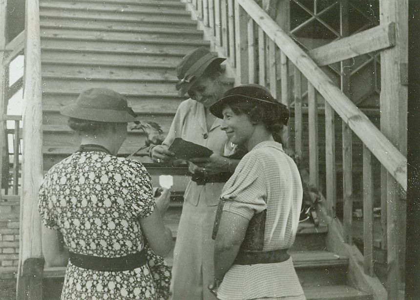 | Nr. inwentarzowy: MŁJ-XVI 1746 / 00 / 109 opis: Tor wyścigów konnych. Przy schodach kibicki: Zofia Dobrzańska, Wanda Leska i Krystyna Bohdanowiczówna. Kobiety w kapeluszach i letnich sukienkach.czas powstania - daty graniczne: 1936-07-19 - 1936-07-19miejsce: Wilno, Pośpieszka.osoby: Zofia Dobrzańska (1909-1989), zd. Zakrzeńska, żona mjra Henryka Dobrzańskiego w latach 1932-1937, s.v. Zwierkowska. Wanda Bohdanowicz zd. Leska (1908-1991), córka Juliusza Leskiego i Marii zd. Olszyńskiej, żona Michała Bohdanowicza. Krystyna Bohdanowicz („Krysia”, córka Jana i Maryni zd. Cywińskiej, siostra Heleny i Michała).tworzywo: papier fotograficzny, błyszczącytechnika: odbitka żelatynowo-srebrowa DOP, czarno-białazespół: album rodziny Leskichwymiary (wys. x szer.): 87 x 117 [mm]