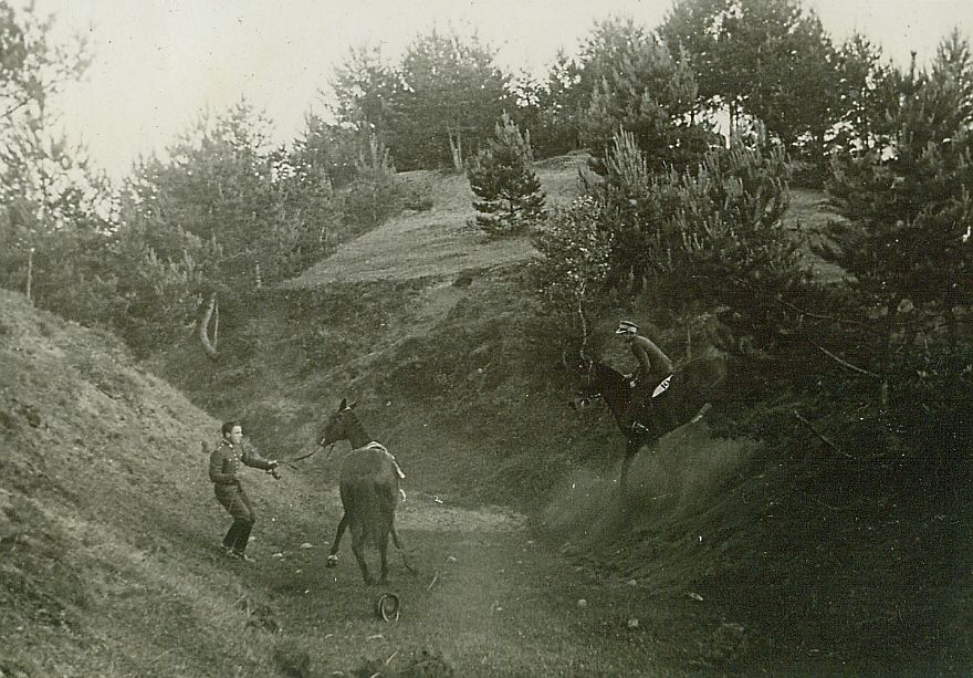 | Nr. inwentarzowy: MŁJ-XVI 1747 / 00 / 063 opis: Okolice toru wyścigów konnych - wojskowy bieg na przełaj im. 13 Pułku Ułanów Wileńskich. Na dnie porośniętego sosnami wąwozu por. Krzyszkowski trzyma za wodze swojego konia, który wstał po upadku. Ze zbocza wąwozu zjeżdża inny oficer.czas powstania - daty graniczne: 1938-06-12 - 1938-06-26miejsce: Wilno, Pośpieszkaosoby: Por. Krzyszkowski.tworzywo: papier fotograficzny, błyszczącytechnika: odbitka żelatynowo-srebrowa DOP, czarno-białazespół: album rodziny Leskichwymiary (wys. x szer.): 59 x 83 [mm]
