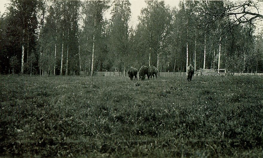 Kilka pasących się żubrów, jednego widać w całości. W głębi ogrodzenie, w tle drzewa.