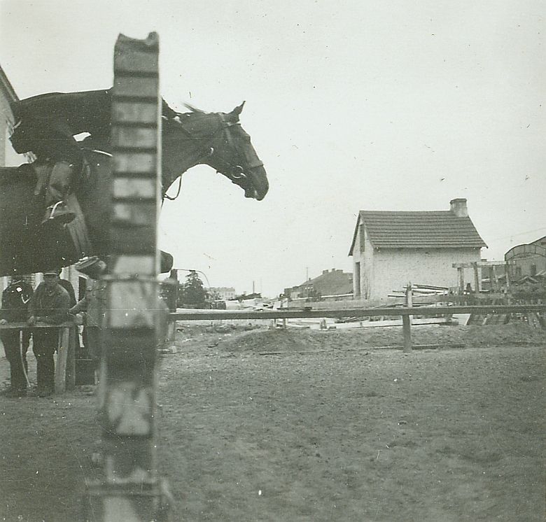 | Nr. inwentarzowy: MŁJ-XVI 1744 / 00 / 041 opis: Fragment ujeżdżalni Policji, przez stacjonatę skacze na koniu ciemnej maści Zofia Kucińska. Zdjęcie z boku, stojak zasłania twarz amazonki (widać ciemny strój treningowy). W tle ogrodzenie, budynki, z lewej kilka osób.czas powstania - daty graniczne: 1931-05-09 - 1931-05-09miejsce: Warszawa, ujeżdżalnia Policjiosoby: Zofia Kucińskatworzywo: papier fotograficzny, błyszczącytechnika: odbitka żelatynowo-srebrowa DOP, czarno-białazespół: album rodziny Leskichwymiary (wys. x szer.): 62 x 63 [mm]