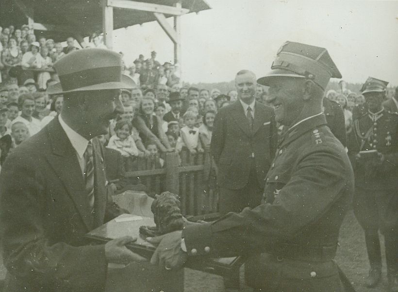 | Nr. inwentarzowy: MŁJ-XVI 1746 / 00 / 116 opis: Tor wyścigów konnych, wręczanie nagrody Wileńskiego Towarzystwa Wyścigów Konnych. Czesław Kozierowski (w garniturze, kapeluszu) wręcza Michałowi Bohdanowiczowi (w mundurze) nagrodę - rzeźbę przedstawiającą lwa(?). Za nimi cywil i oficer. W tle, za ogrodzeniem publiczność, fragment trybuny.czas powstania - daty graniczne: 1936-07-19 - 1936-07-19miejsce: Wilno, Pośpieszka.osoby: Płk Czesław Kozierowski (1890-1940 Charków), do 1932 dow. 4 p.u., potem O.T.O. Rtm. Michał Bohdanowicz "Miś" (1903-1948), 13 p.u., dowódca 1 szwadronu "Tatarskiego".tworzywo: papier fotograficzny, błyszczącytechnika: odbitka żelatynowo-srebrowa DOP, czarno-białazespół: album rodziny Leskichwymiary (wys. x szer.): 87 x 115 [mm]