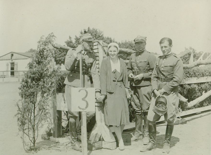 opis: por. Marian Łuszczewski 3 p.u., p. Nieniewska, por. Kazimierz Nieniewski 4 p.s.k., por. Janusz Komorowski 1 p.u.; plac-ujeżdżalnia, grupa stoi przy przeszkodzie nr 3