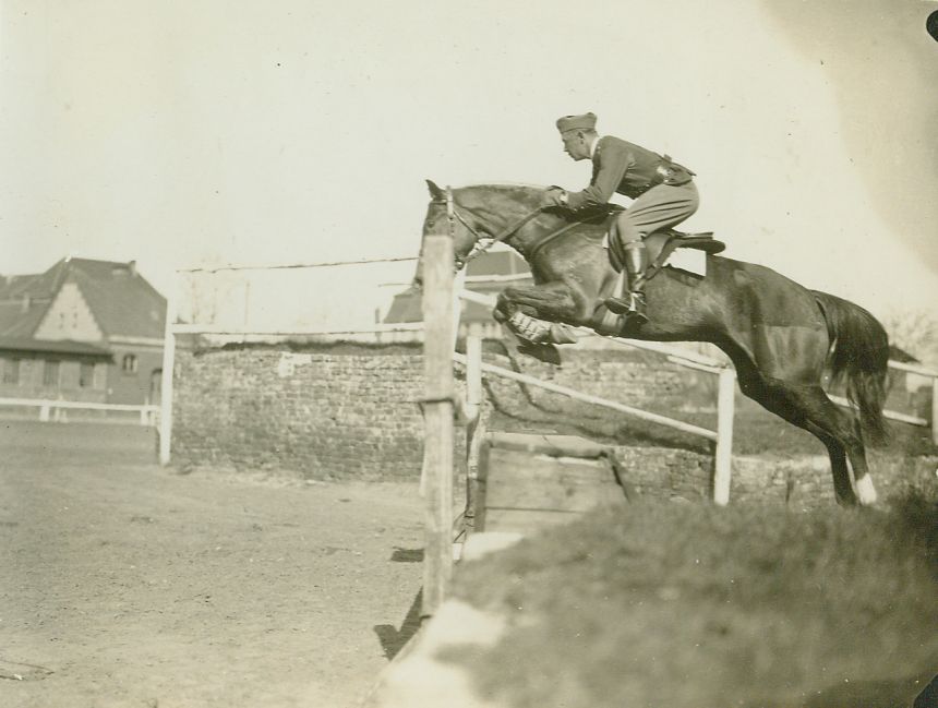 opis: oficer w furażerce, skok przez stacjonatę za górką; plac - ujeżdżalnia C.W.K.; w tle bankiet
