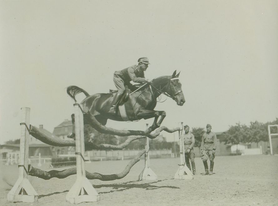 opis: oficer skacze przez double-barre z wygiętych drągów; plac-ujeżdżalnia C.W.K.; przy przeszkodzie żołnierze