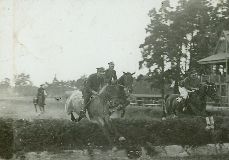 | Nr. inwentarzowy: MŁJ-XVI 1746 / 00 / 099 opis: Tor wyścigów konnych, bieg na przełaj im. Antoniego Alexandrowicza (1870-1930). Cztery konie na i przed przeszkodą (wał, żywopłot?), w kolejności: Tudor pod Bukowskim, Życzliwy pod Michałem Bohdanowiczem, Zebra pod Czesławem Danielczykiem i Argus pod Wołkowiczem. Oficerowie w mundurach, Bukowski i Bohdanowicz w białych bryczesach. W tle żywopłot, ogrodzenie, zabudowania toru, drzewa.czas powstania - daty graniczne: 1936-07-16 - 1936-07-16miejsce: Wilno, Pośpieszka.osoby: Por. Bukowski. Rtm. Michał Bohdanowicz "Miś" (1903-1948), 13 p.u., dowódca 1 szwadronu "Tatarskiego". Por. Czesław Danielczyk, 23 p.u. Por. Wołkowicz.tworzywo: papier fotograficzny, błyszczącytechnika: odbitka żelatynowo-srebrowa DOP, czarno-białazespół: album rodziny Leskichwymiary (wys. x szer.): 84 x 116 [mm] Konie: 1. Tudor, rasa: x, maść ciemnogniada, ur. 1925 - po Tankäuser II xx i Elegantka, hod. J. Jakubowski; koń, na którym w biegach na przełaj w 2. poł. l. 30. XX w. startowali: por. Bukowski, por. R. Pohorecki, por. J. Domański i rtm. M. Bohdanowicz. 2. Życzliwy - koń, na którym rtm. M. Bohdanowicz startował w biegach na przełaj 3. Zebra, klacz - klacz, na której por. Czesław Danielczyk startował w biegach na przełaj 4. Argus - koń, na którym por. Wołkowicz startował w biegach na przełaj.