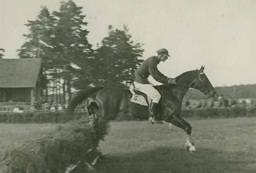 | Nr. inwentarzowy: MŁJ-XVI 1758 / 00 / 013 opis: Tor wyścigów konnych. Por. Jarosław Domański pokonuje płot - hyrdę na koniu Tudor. Jeździec w mundurze i jasnych bryczesach, koń w ochraniaczach na wszystkich nogach. W tle skraj trybuny i okolice toru wyścigów konnych.czas powstania - daty graniczne: 1935-06-30 - 1935-07-21miejsce: Wilno, Pośpieszkaosoby: Por. Jarosław Domański ur. 1908 (4 p.u., "Sławek").tworzywo: papier fotograficzny, błyszczącytechnika: odbitka żelatynowo-srebrowa DOP, czarno-białazespół: album rodziny Bohdanowiczówwymiary (wys. x szer.): 85 x 124 [mm] Koń: 1. Tudor, rasa: x, maść ciemnogniada, ur. 1925 - po Tankäuser II xx i Elegantka, hod. J. Jakubowski; koń, na którym w biegach na przełaj w 2. poł. l. 30. XX w. startowali: por. Bukowski, por. R. Pohorecki, por. J. Domański i rtm. M. Bohdanowicz.