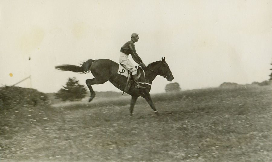 | Nr. inwentarzowy: MŁJ-XVI 1758 / 00 / 102 opis: Tor wyścigów konnych, Steeple-chase Horodźca. Klacz Anna Belle pod rtm. Michałem Bohdanowiczem w trakcie wyścigu (1. miejsce). Koń ląduje po skoku przez przeszkodę. Anna Belle w ogłowiu z nachrapnikiem, w napierśniku, na potniku numer 9.czas powstania - daty graniczne: 1935-07-21 - 1935-07-21miejsce: Wilno, Pośpieszkaosoby: Rtm. Michał Bohdanowicz 1903-1948 (w l.1932-36 i przed II wojną w 4 p.u., nazywany "Misiem"; miłośnik wyścigów płotowych, przeszkodowych i biegów na przełaj).tworzywo: papier fotograficzny, błyszczącytechnika: odbitka żelatynowo-srebrowa DOP, czarno-białazespół: album rodziny Bohdanowiczówwymiary (wys. x szer.): 78 x 125 [mm] Koń: 1. Anna Belle, klacz, rasa: xx, maść skarogniada, ur. 1930 - Illuminator i Beluga, hod. Konstantego Biskupskiego, wł. T. Bruszewskiego, później grona oficerów 14 p.u., startowała w wyścigach płaskich, płotowych i przeszkodowych na torach w Warszawie, Łodzi, Lublinie, Lwowie, Zakopanem i Wilnie w l. 1931-1935, m.in. pod M. Bohdanowiczem i Wł. Korytkowskim, który ją także trenował. Opisywana także jako ciemnogniada., na zdjęciu: 1. miejsce
