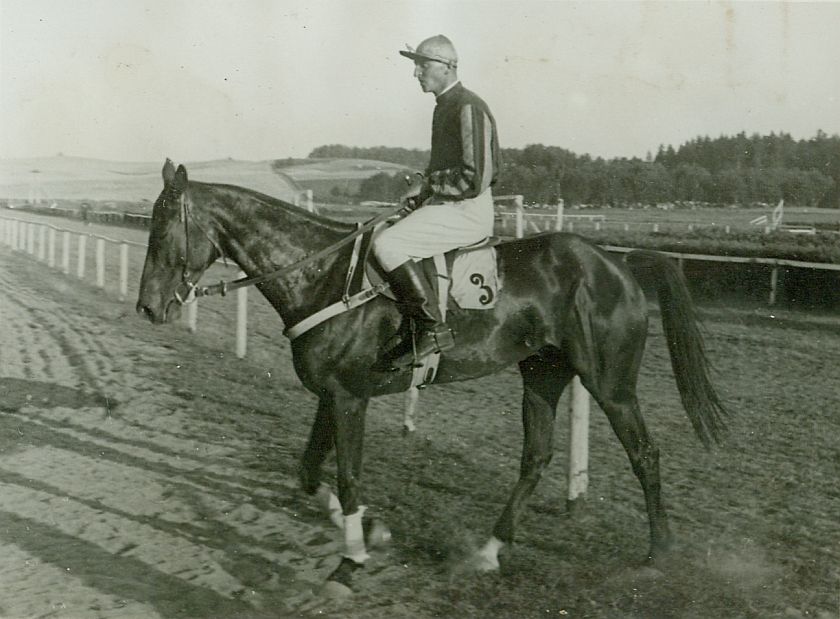 | Nr. inwentarzowy: MŁJ-XVI 1746 / 00 / 112 opis: Tor wyścigów konnych, bieg na przełaj im. Szefa Remontu Płk. Stefana Dembińskiego (1887-1972). Po wygraniu wyścigu kl. Manru (na potniku nr 3) pod Michałem Bohdanowiczem wraca stępem do wagi. Koń w przejściu przez ogrodzenie bieżni. M. Bohdanowicz w stroju wyścigowym (białe bryczesy, ciemna kurtka, czapka i pasy na rękawach w podobnym kolorze. W tle wewnętrzna część toru, pagórki.czas powstania - daty graniczne: 1936-07-19 - 1936-07-19miejsce: Wilno, Pośpieszka.osoby: Rtm. Michał Bohdanowicz "Miś" (1903-1948), 13 p.u., dowódca 1 szwadronu "Tatarskiego".tworzywo: papier fotograficzny, błyszczącytechnika: odbitka żelatynowo-srebrowa DOP, czarno-białazespół: album rodziny Leskichwymiary (wys. x szer.): 88 x 117 [mm] Koń: 1. Manru, klacz, maść gniada - koń, na którym startowali M. Bohdanowicz i T. Rybicki w biegach na przełaj.