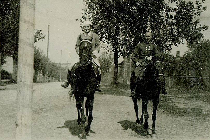 | Nr. inwentarzowy: MŁJ-XVI 1759 / 00 / 050 opis: Przejażdżka w miejscu zakwaterowania męża. Drogą na przedmieściach Nowej Wilejki jadą konno: Wanda Bohdanowicz na koniu Kazik i rtm. Włodzimierz Prosiński na koniu Pardon. Kobieta w codziennym stroju jeździeckim, w tym w jasnym berecie, mężczyzna w mundurze.data: maj 1936 r.czas powstania - daty graniczne: 1936-05-01 - 1936-05-31miejsce: Nowo-Wilejka, Nowa Wilejka, obecnie Litwaosoby: Wanda Bohdanowicz 1908-1991 (z domu Leska, miłośniczka sportów, zwłaszcza konnych, wyścigów, żona rtm. Michała Bohdanowicza); rtm. Włodzimierz Prosiński ur. 1894 (13 p.u., miłośnik sportu, zwłaszcza konnego: skoki, Militari, wyścigi).tworzywo: papier fotograficzny, błyszczącytechnika: odbitka żelatynowo-srebrowa DOP, czarno-białazespół: album rodziny Bohdanowiczówwymiary (wys. x szer.): 56 x 83 [mm] Konie: 1. Kazik, wałach, maść skarogniada, ur. 1925 - Rock-Roy – Merilla, hod. H. Jechalskiego, wł. Wandy Leskiej-Bohdanowicz; w 1930 roku właścicielka trenowała go na ujeżdżalni W.S.Woj., startowała na nim m.in. w Warszawie, podczas Krajowych Zawodów Konnych w 1932 r.; w 1933 r. wygrywali na nim biegi przełajowe M. Bohdanowicz i J. Domański. W 1937 r. startował w Grudziądzu i Gnieźnie 2. Pardon, wałach - koń, na którym pod koniec l. 30. XX w. startował rtm. Włodzimierz Prosiński.