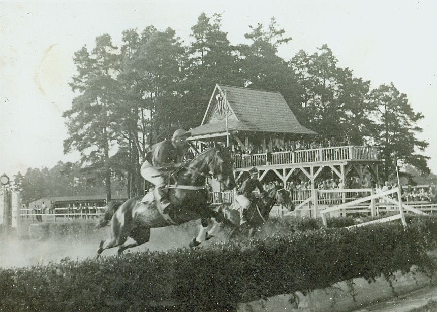 | Nr. inwentarzowy: MŁJ-XVI 1746 / 00 / 110 opis: Tor wyścigów konnych, bieg na przełaj im. Szefa Remontu Płk. Stefana Dembińskiego (1887-1972). Przez hyrdę z rowem skaczą: kl. Manru pod Michałem Bohdanowiczem i kl. Zalotna pod Bukowskim. M. Bohdanowicz w stroju wyścigowym, Bukowski w mundurze i białych bryczesach. W tle drewniana trybuna, na niej i obok liczna publiczność. Widać "bombę".czas powstania - daty graniczne: 1936-07-19 - 1936-07-19miejsce: Wilno, Pośpieszka.osoby: Rtm. Michał Bohdanowicz "Miś" (1903-1948), 13 p.u., dowódca 1 szwadronu "Tatarskiego". Por. Bukowski.tworzywo: papier fotograficzny, błyszczącytechnika: odbitka żelatynowo-srebrowa DOP, czarno-białazespół: album rodziny Leskichwymiary (wys. x szer.): 87 x 118 [mm] Konie: 1. Manru, klacz, maść gniada - koń, na którym startowali M. Bohdanowicz i T. Rybicki w biegach na przełaj. 2. Zalotna, klacz - Shagya X - Szabla, koń, na którym w biegach na przełaj startował M. Bohdanowicz i por. Bukowski.
