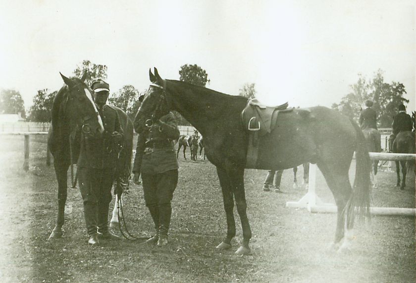 | Nr. inwentarzowy: MŁJ-XVI 1758 / 00 / 006 opis: Tor wyścigów konnych. Trawiasty plac z ogrodzeniami z drągów. Żołnierze trzymają osiodłane konie: Bubek (stoi przodem) i Kazik (stoi bokiem). W tle kilka koni i osób, drzewa.data: czerwiec - lipiec 1935 r.czas powstania - daty graniczne: 1935-06-01 - 1934-07-31miejsce: Wilno, Pośpieszkatworzywo: papier fotograficzny, błyszczącytechnika: odbitka żelatynowo-srebrowa DOP, czarno-białazespół: album rodziny Bohdanowiczówwymiary (wys. x szer.): 56 x 81 [mm] Konie: 1. Bubek, maść kasztanowata - koń, na którym w 1935 r. Wanda Bohdanowicz startowała w konkursie skoków na terenie toru wyścigów konnych Wilno - Pośpieszka i w biegu myśliwskim 4 p.u. 2. Kazik, wałach, maść skarogniada, ur. 1925 - Rock-Roy – Merilla, hod. H. Jechalskiego, wł. Wandy Leskiej-Bohdanowicz; w 1930 roku właścicielka trenowała go na ujeżdżalni W.S.Woj., startowała na nim m.in. w Warszawie, podczas Krajowych Zawodów Konnych w 1932 r.; w 1933 r. wygrywali na nim biegi przełajowe M. Bohdanowicz i J. Domański. W 1937 r. startował w Grudziądzu i Gnieźnie