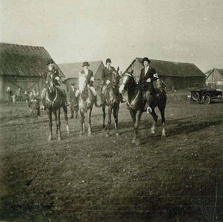 | Nr. inwentarzowy: MŁJ-XVI 1744 / 00 / 003 opis: Bieg św. Huberta Warszawa-Wilanów. Uczestniczki (ciemne fraki i meloniki, W. Leska w toczku. na lewych ramionach jasne opaski z numerami) na koniach pozują do zdjęcia. Od lewej: Karola Romiszowska (Pałasz), Paulina Jaroszewicz (siwy Duduś), W. Leska (Kazik), J. Słaboszewicz (Mandaryn). Za nimi samochód, kibice, wiejskie budynki.czas powstania - daty graniczne: 1930-11-04 - 1930-11-04miejsce: Warszawa, Wilanówosoby: od lewej: Karola Romiszowska (w jednym z podpisów w albumie z 1931 r.: mjr. Romiszowska - majorowa?); Paulina "Lusia" Jaroszewiczowa, Wanda Leska 1908-1991, Janina [Nina, Ninula] Kirn-Słaboszewicz 1910-1975.tworzywo: papier fotograficzny, błyszczącytechnika: odbitka żelatynowo-srebrowa DOP, czarno-białazespół: album rodziny Leskichwymiary (wys. x szer.): 60 x 60 [mm] Konie: 1. Kazik, wałach, maść skarogniada, ur. 1925 - Rock-Roy – Merilla, hod. H. Jechalskiego, wł. Wandy Leskiej-Bohdanowicz; w 1930 roku właścicielka trenowała go na ujeżdżalni W.S.Woj., startowała na nim m.in. w Warszawie, podczas Krajowych Zawodów Konnych w 1932 r.; w 1933 r. wygrywali na nim biegi przełajowe M. Bohdanowicz i J. Domański. W 1937 r. startował w Grudziądzu i Gnieźnie, na zdjęciu: pod W. Leską 2. Duduś, wałach, maść siwa - koń, na którym jeździła Paulina Jaroszewiczowa, na zdjęciu: pod L. Jaroszewiczową 3. Mandaryn, wałach, maść kasztanowata, ur. 1920 - hod. NN, wł. Niny Słaboszewicz; oprócz właścicielki dosiadała go Anna Leska, na zdjęciu: pod J. Słaboszewiczówną 4. Pałasz, wałach - koń, na którym jeździła Karola Romiszowska, na zdjęciu: pod Karolą Romiszowską