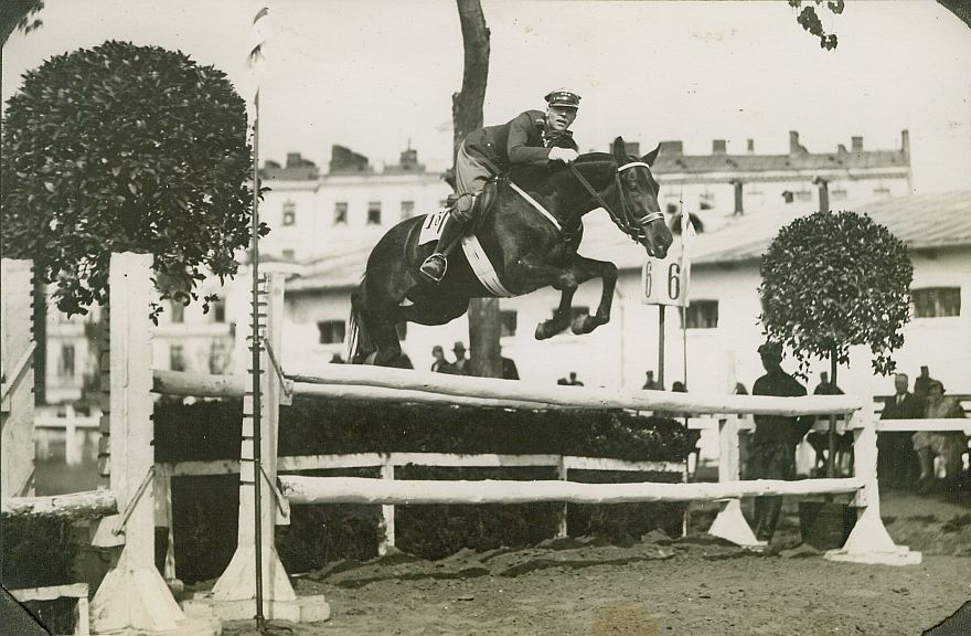 | Nr. inwentarzowy: MŁJ-XVI 1744 / 00 / 057 opis: Konkurs Klubu Sportowego Rodziny Wojskowej, plac konkursowy. Przez jasny okser z hyrdą skacze rtm. Wilhelm Lewicki na klaczy Kikimora. Przy przeszkodzie stoi żołnierz, po bokach donice z drzewkami. Z tyłu kibice, ogrodzenie, budynek.czas powstania - daty graniczne: 1931-05-14 - 1931-05-14miejsce: Warszawa, ujeżdżalnia Szwadronu Sztabowegoosoby: Wilhelm [Wil] Rogala-Lewicki (1898-1992)tworzywo: papier fotograficzny, półmatowytechnika: odbitka żelatynowo-srebrowa DOP, czarno-białazespół: album rodziny Leskichwymiary (wys. x szer.): 115 x 177 [mm] Koń: 1. Kikimora, klacz, maść skarogniada, ur. 1925 - po Parachute xx i NN, hod. Henryk Jechalski, wł. W. Lewicki. 1933 - 1 m. w PN w Łazienkach i 3 m. w MP w skokach. 1934 – 1 m. w MP w skokach; 1935 r. gł. nagr. ind. w Łazienkach; szykowana do berlińskiej olimpiady