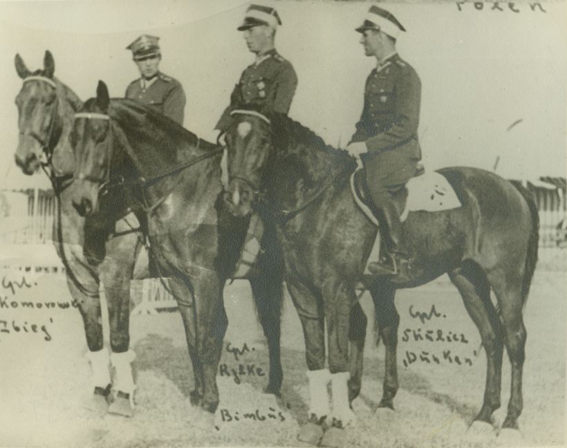 | Nr. inwentarzowy: MŁJ-XVI 1639 / 00 / 011 opis: Polska drużyna, która w 1939 r. zdobyła 3 m. w Konkursie Armii Polskiej w Nicei. Od lewej stoją: rtm. Janusz Komorowski i Zbieg, rtm. Aleksander Rylke i Bimbus, rtm. Bronisław Skulicz i Dunkan. Plac konkursowy, konie w rzędach sportowych, w głębi namioty w pasy. U góry napis Polen, przy jeźdźcach podpisy (stopień, nazwisko,nazwa konia).data: podano daty pierwszego dnia konkursów w Nicei i pierwszego dnia następujących po nich konkursów w Rzymieczas powstania - daty graniczne: 1939-04-15 - 1939-04-30miejsce: Niceaosoby: rtm. Janusz Komorowski 1 p.u., rtm. Aleksander] Rylke 14 p.u., rtm. Bronisław Skulicz 2 p.u.inne nazwy własne: Nizza (Nicea)tworzywo: papier fotograficzny, matowytechnika: odbitka żelatynowo-srebrowa z innej odbitkizespół: album Clemensa Nagla Międzynarodowi artyści w jeździe przez przeszkodywymiary (wys. x szer.): 126 x 156 [mm] Konie: 1. Zbieg II, wałach, rasa: 1/2 krwi deresz i am. kłusaczka, maść gniado-dereszowata, ur. 1927 - Derwisz-Brunetka, hod. Stępczyński, wł. CWK. Mocny, szybki, ogromna potęga. W 1936 wygrał PN w Rydze. Startował pod Sokołowskim na IO w Berlinie w skokach. Do wojny startował pod J. Komorowskim, m.in. 1. m. w PN na CHIO w Warszawie 1938 r., na zdjęciu: 12 lat 2. Bimbus, wałach, maść gniada - kariera tuż przed II wojną światową, reprezentował nas w Pucharach Narodów, koń klasy międzynarodowej 3. Dunkan, wałach, rasa: xo, maść gniada, ur. 1926 - hod. Kazimierza Kotlińskiego; startował w ujeżdżeniu, skokach i WKKW, wł. rtm. W. Lewicki, który startował na nim i odnosił międzynarodowe sukcesy. Z powodzeniem startował na nim także rtm. Br. Skulicz. Koń olimpijski (skoki - J. Komorowski, Berlin 1936, jedyna polska para, która ukończyła konkurs)