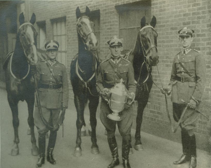 | Nr. inwentarzowy: MŁJ-XVI 1639 / 00 / 010 opis: Polska drużyna, która w 1927 r. zdobyła w Nowym Jorku Puchar Narodów. Od lewej: rtm. Michał Antoniewicz i Readglet, mjr Karol Rómmel i Fagas, por. Stefan Starnawski i Jacek. Przed budynkiem z cegły stoją z osiodłanymi końmi. Antoniewicz w okrągłej czapce, Rómmel i Starnawski w rogatywkach. Stojący w środku Rómmel trzyma puchar.czas powstania - daty graniczne: 1927-11-12 - 1939-08-31osoby: rtm. Michał Antoniewicz 2 p.szw., mjr Karol Rómmel1 p.szw., por. Stefan Starnawski 20 p.u.tworzywo: papier fotograficzny, matowytechnika: odbitka żelatynowo-srebrowa z innej odbitkizespół: album Clemensa Nagla Międzynarodowi artyści w jeździe przez przeszkodywymiary (wys. x szer.): 127 x 162 [mm] Konie: 1. Fagas, wałach 2. Jacek, wałach, maść skarogniada - pochodzenia amerykańskiego, import z Francji, koń olimpijski 3. Readgledt, wałach - import z Irlandii, wł. Grupa Sportu Konnego. Dosiadany m.in. przez Starnawskiego i Kuleszę. Pod Szoslandem wygrał PN: 1926 r. Nowy Jork, 1927 r. Warszawa. Pod Antoniewiczem na IO w 1928 r. w skokach – srebro w PN, indywidualnie 20. Spokojny i pewny.