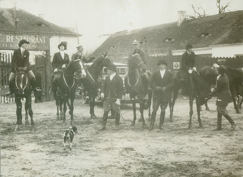| Nr. inwentarzowy: MŁJ-XVI 1744 / 00 / 012 opis: Po Biegu św. Huberta urządzonym przez pp. Skarżyńskich. 6 koni i ośmioro jeźdźców w szeregu: panie (w tym W. Leska na koniu Kazik), cywile i oficerowie. W tle Café Restaurant Wilanów. Uczestnicy w strojach jeździeckich lub mundurach. Wojskowi i 3 kobiety w siodłach. Przed nimi piesek. Z tyłu samochód, budynki z "wolimi oczkami" kryte dachówką.czas powstania - daty graniczne: 1930-11-09 - 1930-11-09miejsce: Warszawa, Wilanów, obok Café Restaurant Wilanówosoby: pierwsza a prawej, na koniu Wanda Leska (1908-1991)tworzywo: papier fotograficzny, półbłyszczącytechnika: odbitka żelatynowo-srebrowa DOP, czarno-białazespół: album rodziny Leskichwymiary (wys. x szer.): 90 x 121 [mm] Koń: 1. Kazik, wałach, maść skarogniada, ur. 1925 - Rock-Roy – Merilla, hod. H. Jechalskiego, wł. Wandy Leskiej-Bohdanowicz; w 1930 roku właścicielka trenowała go na ujeżdżalni W.S.Woj., startowała na nim m.in. w Warszawie, podczas Krajowych Zawodów Konnych w 1932 r.; w 1933 r. wygrywali na nim biegi przełajowe M. Bohdanowicz i J. Domański. W 1937 r. startował w Grudziądzu i Gnieźnie