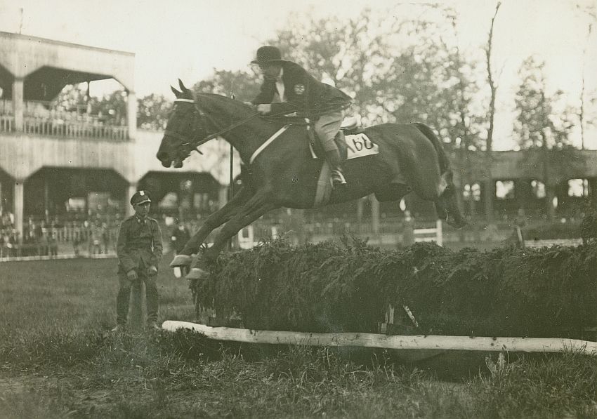| Nr. inwentarzowy: MŁJ-XVI 1754 / 02 / 010 opis: Krajowe Zawody Konne. Wanda Leska [Bohdanowicz] w skoku na koniu Kazik. Na potniku prawdopodobnie nr 68. Przy przeszkodzie (hyrda na rowie) siedzi żołnierz. W tle kryta trybuna z liczną publicznością. Prawdopodobnie konkurs Otwarcia - III seria dla pań i jeźdźców cywilnych. Para Leska - Kazik zdobyła w tym konkursie wstęgę honorową.data: 14 maja - konkurs Otwarcia lub 16 maja - konkurs św. Jerzegoczas powstania - daty graniczne: 1932-05-14 - 1932-05-16miejsce: Warszawa, hipodrom w Łazienkachosoby: Amazonka z Klubu Sportowego Rodziny Wojskowej: Wanda Leska 1908-1991 (od 1932 r. Bohdanowicz).tworzywo: papier fotograficzny, błyszczącytechnika: odbitka żelatynowo-srebrowa DOP, czarno-białazespół: album rodziny Bohdanowiczówwymiary (wys. x szer.): 125 x 172 [mm] Koń: 1. Kazik, wałach, maść skarogniada, ur. 1925 - Rock-Roy – Merilla, hod. H. Jechalskiego, wł. Wandy Leskiej-Bohdanowicz; w 1930 roku właścicielka trenowała go na ujeżdżalni W.S.Woj., startowała na nim m.in. w Warszawie, podczas Krajowych Zawodów Konnych w 1932 r.; w 1933 r. wygrywali na nim biegi przełajowe M. Bohdanowicz i J. Domański. W 1937 r. startował w Grudziądzu i Gnieźnie