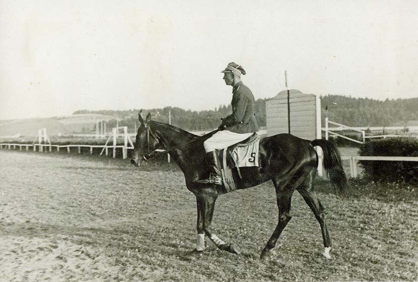 | Nr. inwentarzowy: MŁJ-XVI 1758 / 00 / 099 opis: Tor wyścigów konnych, Wojskowy bieg na przełaj im. 1 Pułku Szwoleżerów Józefa Piłsudskiego. Klacz Manru pod rtm. Michałem Bohdanowiczem po wygraniu wraca bieżnią do wagi. Jeździec w mundurze i jasnych bryczesach. Koń w ochraniaczach na przednich nogach, na potniku numer 5. W tle bariera (kanat), celownik, częściowo zalesione pagórki..czas powstania - daty graniczne: 1935-07-18 - 1935-07-18miejsce: Wilno, Pośpieszkaosoby: Rtm. Michał Bohdanowicz 1903-1948 (syn Jana Bohdanowicza i Marii z Cywińskich. W latach 1932-1936 i przed II wojną w 4 Pułku Ułanów Zaniemeńskich, od 1936 w 13 Pułku Ułanów Wileńskich; nazywany "Misiem"; miłośnik wyścigów płotowych, przeszkodowych i biegów na przełaj).tworzywo: papier fotograficzny, błyszczącytechnika: odbitka żelatynowo-srebrowa DOP, czarno-białazespół: album rodziny Bohdanowiczówwymiary (wys. x szer.): 85 x 124 [mm] Koń: 1. Manru, klacz, maść gniada - koń, na którym startowali M. Bohdanowicz i T. Rybicki w biegach na przełaj., na zdjęciu: 1. miejsce