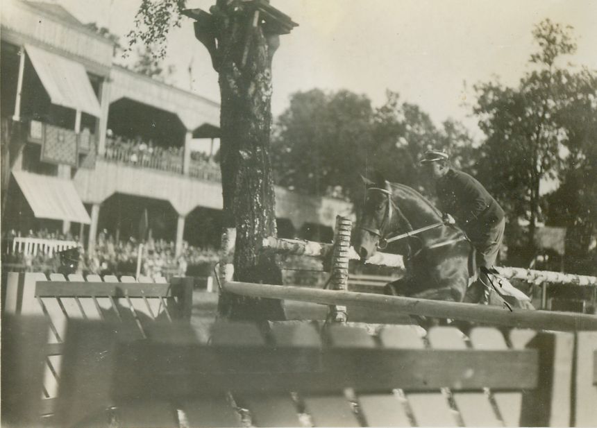 | Nr. inwentarzowy: MŁJ-XVI 1743 / 00 / 027 opis: Międzynarodowe zawody konne. Płk Al. Pragłowski w skoku na ciemnej maści wałachu Łuszer przez przeszkodę zasłoniętą inną przeszkodą. Koń w sportowym rzędzie (ogłowie wędzidłowe). Przy przeszkodzie pień drzewa, w tle drewniana trybuna z publicznością.czas powstania - daty graniczne: 1930-06-01 - 1930-06-11miejsce: Warszawa, Łazienki, hipodromosoby: płk Aleksander Radwan-Pragłowski (1895-1974), dowódca 17 p.u.tworzywo: papier fotograficzny, błyszczącytechnika: odbitka żelatynowo-srebrowa DOP, czarno-białazespół: album rodziny Leskichwymiary (wys. x szer.): 87 x 118 [mm] Koń: 1. Łuszer, wałach, maść gniada, ur. 1921, na zdjęciu: 11 lat