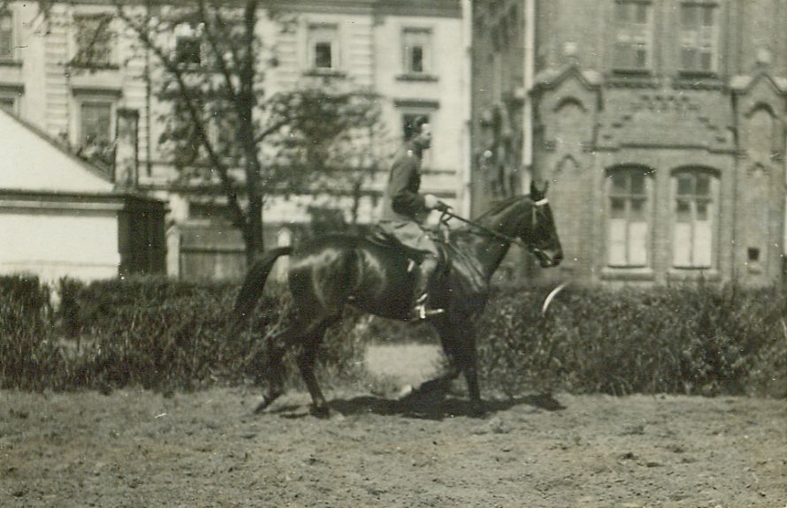 | Nr. inwentarzowy: MŁJ-XVI 1743 / 00 / 003 opis: Prawdopodobnie rtm. Wilhelm Lewicki w kłusie na klaczy Kikimora, trening. Jeździec w kurtce mundurowej, bryczesach i długich butach z ostrogami jedzie kłusem przy żywopłocie okalającym plac treningowy. W tle budynki.czas powstania - daty graniczne: 1930-05-01 - 1930-05-31miejsce: Warszawa, ul. Koszykowa 79, Wyższa Szkoła Wojenna, ujeżdżalniaosoby: Prawdopodobnie rtm. Wilhelm Rogala-Lewicki (1898-1992)inne nazwy własne: W.S.W - WSW - W.S.Woj. - Wyższa Szkoła Wojennatworzywo: papier fotograficzny, błyszczącytechnika: odbitka żelatynowo-srebrowa DOP, czarno-białazespół: album rodziny Leskichwymiary (wys. x szer.): 61 x 91 [mm] Koń: 1. Kikimora, klacz, maść skarogniada, ur. 1925 - po Parachute xx i NN, hod. Henryk Jechalski, wł. W. Lewicki. 1933 - 1 m. w PN w Łazienkach i 3 m. w MP w skokach. 1934 – 1 m. w MP w skokach; 1935 r. gł. nagr. ind. w Łazienkach; szykowana do berlińskiej olimpiady