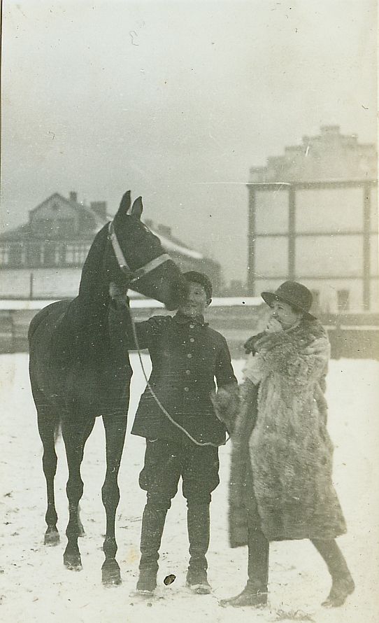 | Nr. inwentarzowy: MŁJ-XVI 1744 / 00 / 026 opis: Ośnieżony plac, w głębi budynki. Po lewej stoi koń ciemnej maści, w kantarze, za uwiąz trzyma żołnierz w czapce, kurtce mundurowej, bryczesach i długich butach. Obok Wanda Leska w zarzuconym na strój jeździecki futrze i w kapeluszu. Kazik to jej ulubiony koń.czas powstania - daty graniczne: 1931-03-01 - 1931-03-31miejsce: Warszawaosoby: Wanda Leska (1908-1991)tworzywo: papier fotograficzny, błyszczącytechnika: odbitka żelatynowo-srebrowa DOP, czarno-białazespół: album rodziny Leskichwymiary (wys. x szer.): 91 x 58 [mm] Koń: 1. Kazik, wałach, maść skarogniada, ur. 1925 - Rock-Roy – Merilla, hod. H. Jechalskiego, wł. Wandy Leskiej-Bohdanowicz; w 1930 roku właścicielka trenowała go na ujeżdżalni W.S.Woj., startowała na nim m.in. w Warszawie, podczas Krajowych Zawodów Konnych w 1932 r.; w 1933 r. wygrywali na nim biegi przełajowe M. Bohdanowicz i J. Domański. W 1937 r. startował w Grudziądzu i Gnieźnie