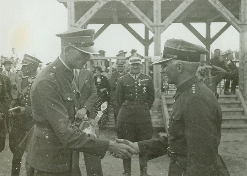 | Nr. inwentarzowy: MŁJ-XVI 1746 / 00 / 115 opis: Tor wyścigów konnych, wręczanie nagród. Jarosław Domański podaje rękę Janowi Goszczyńskiemu. J. Domański trzyma w ręku kryształową karafkę, którą wręczy J. Goszczyńskiemu. Obaj oficerowie w mundurach. Na naramienniku J. Goszczyńskiego cyfra 5. Za nimi cywil i dwóch oficerów, dalej publiczność na i przy schodach trybuny.czas powstania - daty graniczne: 1936-07-19 - 1936-07-19miejsce: Wilno, Pośpieszka.osoby: Por. Jarosław Domański „Sławek”, 4 p.u., konkursy skoków, wyścigi. Por. Jan Goszczyński (1896-?), 5 DAK, właściciel stajni wyścigowej.tworzywo: papier fotograficzny, błyszczącytechnika: odbitka żelatynowo-srebrowa DOP, czarno-białazespół: album rodziny Leskichwymiary (wys. x szer.): 86 x 118 [mm]