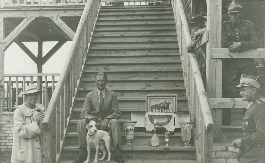 | Nr. inwentarzowy: MŁJ-XVI 1746 / 00 / 055 opis: Tor wyścigów konnych. Na drewnianych schodach i przy nich kilka osób. Z lewej stoi Wanda Bohdanowicz w jasnym płaszczu i kapeluszu. Na schodach siedzi Michał Bohdanowicz w garniturze z psem Kimi i wygranymi nagrodami (puchary, karafka, obraz). Z prawej przy schodach por. Tadeusz Tyczyński w mundurze. czas powstania - daty graniczne: 1936-06-28 - 1936-07-09miejsce: Wilno, Pośpieszka.osoby: Wanda Bohdanowicz zd. Leska (1908-1991), córka Juliusza Leskiego i Marii zd. Olszyńskiej, żona Michała Bohdanowicza. Rtm. Michał Bohdanowicz "Miś" (1903-1948), 13 p.u., dowódca 1 szwadronu "Tatarskiego". Por. Tadeusz Tyczyński 13 p.u. tworzywo: papier fotograficzny, matowytechnika: odbitka żelatynowo-srebrowa DOP, czarno-białazespół: album rodziny Leskichwymiary (wys. x szer.): 85 x 136 [mm]