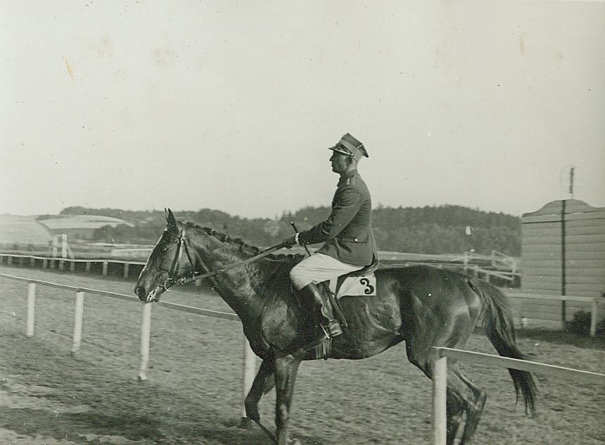 | Nr. inwentarzowy: MŁJ-XVI 1746 / 00 / 068 opis: Tor wyścigów konnych, Steeple-chase im. Pierwszego Marszałka Polski Józefa Piłsudskiego. Bakarat (na potniku numer 3) pod Michałem Bohdanowiczem (białe bryczesy, kurtka i czapka mundurowa) zjeżdża z toru po zajęciu 2. m. Przejeżdża przez bramkę w zewnętrznej barierze. Za nim celownik, w tle pagórki.czas powstania - daty graniczne: 1936-07-12 - 1936-07-12miejsce: Wilno, Pośpieszka.osoby: Rtm. Michał Bohdanowicz "Miś" (1903-1948), 13 p.u., dowódca 1 szwadronu "Tatarskiego".tworzywo: papier fotograficzny, błyszczącytechnika: odbitka żelatynowo-srebrowa DOP, czarno-białazespół: album rodziny Leskichwymiary (wys. x szer.): 84 x 114 [mm] Koń: 1. Bakarat, ogier, rasa: xx, maść kasztanowata, ur. 1925 - (od 1934 wałach), Harsona – Balata, hod. Romana Czaykowskiego, wł. K. Dzierzbickiego, później Z. Cierpickiego. Startował w l. 1927-1937 w gonitwach płaskich, płotowych i przeszkodowych (prawie 100x, 1/3 zwycięstw) na torach w Baranowiczach, Łodzi, Wilnie, Bydgoszczy, Poznaniu, Kielcach, Radomiu, Lublinie, Warszawie. Dosiadali go: M. Bohdanowicz, por. Kwieciński, j. Ustinow, j. Gajewski, dż. Kucharski; trenerzy: S. Kowalski, Z. Cierpicki, S. Balcer, M. Bohdanowicz.