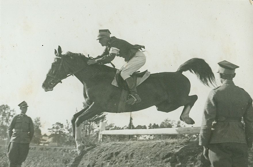 | Nr. inwentarzowy: MŁJ-XVI 1746 / 00 / 002 opis: Tor wyścigów konnych, zawody w skokach przez przeszkody - Konkurs Otwarcia. W skoku przez wał ze stacjonatą na koniu Talar III Michał Bohdanowicz. Jeździec w jasnych bryczesach, kurtce i czapce mundurowej. Data i jasny otok wskazują, że występuje w barwach 13 p.u. Przeszkoda na trawie, po bokach stoją żołnierze.czas powstania - daty graniczne: 1936-06-28 - 1936-06-28miejsce: Wilno, Pośpieszka.osoby: Rtm. Michał Bohdanowicz "Miś" (1903-1948). Syn Jana Bohdanowicza i Marii z Cywińskich. W latach 1932-1936 służył w 4 Pułku Ułanów Zaniemeńskich, od 1936 w 13 Pułku Ułanów Wileńskich, jako dowódca 1 szwadronu "Tatarskiego", przed wojną wraca do 4 p.u.tworzywo: papier fotograficzny, błyszczącytechnika: odbitka żelatynowo-srebrowa DOP, czarno-białazespół: album rodziny Leskichwymiary (wys. x szer.): 86 x 126 [mm] Koń: 1. Talar III, wałach, maść kasztanowata - hod. Bogumiła Hebanowskiego; ur. przed 1928, prywatny koń Michała Bohdanowicza, który startował na nim w konkursach ujeżdżenia, skoków (np. Mitingi Popularne PZJ 1938-39 i WKKW ("Militari"), biegach myśliwskich, skiringu, uczestniczył w ćwiczeniach wojskowych. Dosiadała go też żona Michała - Wanda (m.in. w 1937 r. w Grudziądzu)..