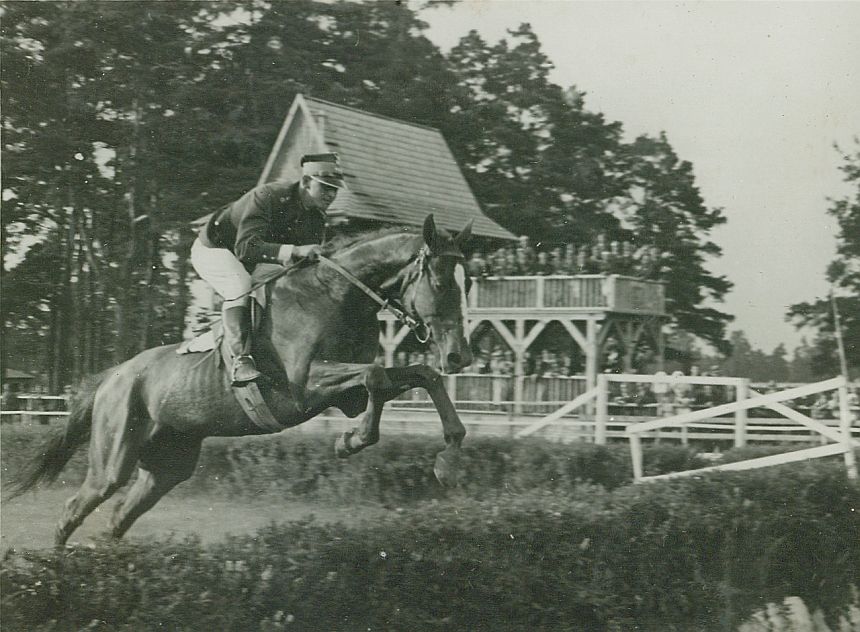 | Nr. inwentarzowy: MŁJ-XVI 1746 / 00 / 067 opis: Tor wyścigów konnych, Steeple-chase im. Pierwszego Marszałka Polski Józefa Piłsudskiego. Bakarat pod Michałem Bohdanowiczem (białe bryczesy, kurtka i czapka mundurowa) w skoku trybunowym (widać żywopłot, prawdopodonie z rowem). W tle żywopłot, ogrodzenie, ludzie na drewnianej trybunie, drzewa.czas powstania - daty graniczne: 1936-07-12 - 1936-07-12miejsce: Wilno, Pośpieszka.osoby: Rtm. Michał Bohdanowicz "Miś" (1903-1948), 13 p.u., dowódca 1 szwadronu "Tatarskiego".tworzywo: papier fotograficzny, błyszczącytechnika: odbitka żelatynowo-srebrowa DOP, czarno-białazespół: album rodziny Leskichwymiary (wys. x szer.): 84 x 113 [mm] Koń: 1. Bakarat, ogier, rasa: xx, maść kasztanowata, ur. 1925 - (od 1934 wałach), Harsona – Balata, hod. Romana Czaykowskiego, wł. K. Dzierzbickiego, później Z. Cierpickiego. Startował w l. 1927-1937 w gonitwach płaskich, płotowych i przeszkodowych (prawie 100x, 1/3 zwycięstw) na torach w Baranowiczach, Łodzi, Wilnie, Bydgoszczy, Poznaniu, Kielcach, Radomiu, Lublinie, Warszawie. Dosiadali go: M. Bohdanowicz, por. Kwieciński, j. Ustinow, j. Gajewski, dż. Kucharski; trenerzy: S. Kowalski, Z. Cierpicki, S. Balcer, M. Bohdanowicz.