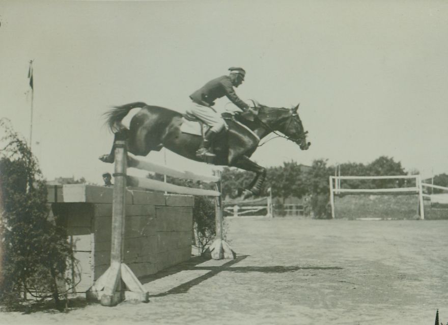 opis: rtm. Kazimierz Szosland 2 p.u., skok przez mur ze stacjonatą, w głębi bankiet - koń Alli