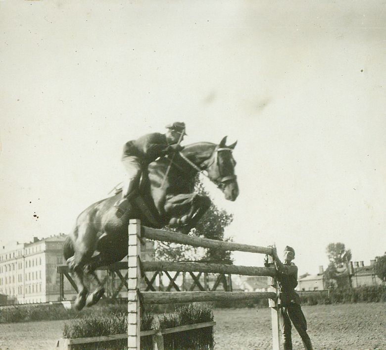 | Nr. inwentarzowy: MŁJ-XVI 1753 / 00 / 073 opis: Rtm. Wilhelm Lewicki na koniu Olaf w treningowym skoku przez wysoką stacjonatę ze wskazówką - płotkiem. Przy przeszkodzie stoi żołnierz i trzyma koniec górnego drąga. W tle widać m.in. okazały gmach i stalową konstrukcję przęsła.data: wrzesień 1929 r.czas powstania - daty graniczne: 1929-09-01 - 1929-09-30miejsce: Warszawa, ul. Koszykowa 79, Wyższa Szkoła Wojenna, ujeżdżalniaosoby: Rtm. Wilhelm Rogala-Lewicki 1898-1992 Londyn ("Wil", jeździec klasy międzynarodowej, w 1929 r. reprezentował w konkursach W.S.W. - był w niej głównym instruktorem jazdy konnej)inne nazwy własne: W.S.W - WSW - W.S.Woj. - Wyższa Szkoła Wojennatworzywo: papier fotograficzny, błyszczącytechnika: odbitka żelatynowo-srebrowa DOP, czarno-białazespół: album rodziny Bohdanowiczówwymiary (wys. x szer.): 78 x 85 [mm] Koń: 1. Olaf, wałach, rasa: wsch. pr., maść kasztanowata, ur. 1921 - Tausch i Alfreda, hod. Wawrzyniak, wł. M.S.Wojsk., CWK; startował pod W. Lewickim, K. Szoslandem, S. Kuleszą, pod R. Pohoreckim występował w Nicei i zdobył MP w skokach w 1933 roku