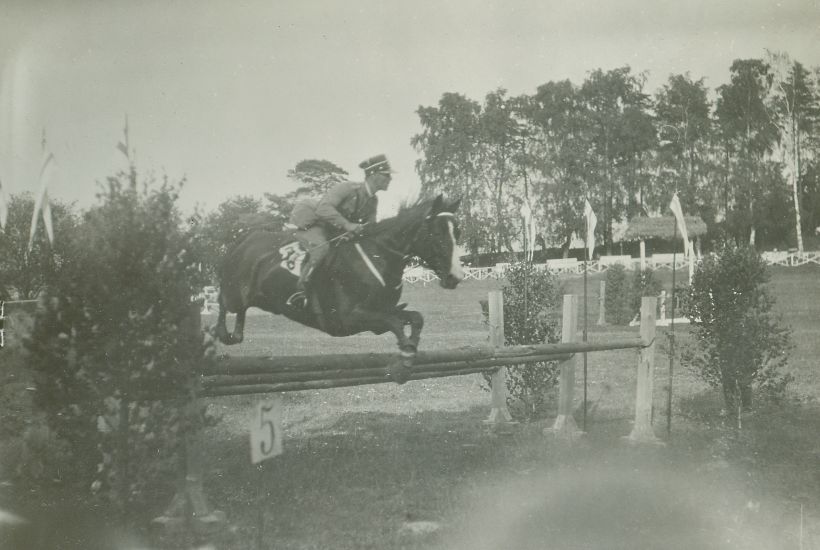 | Nr. inwentarzowy: MŁJ-XVI 1753 / 00 / 023 opis: Letnie konkursy hipiczne. Rtm. Wilhelm Lewicki skacze na klaczy Mira przez triple-barre (numer 5). Przeszkoda przy szrankach, w głębi widać przeciwległe, jasne ogrodzenie placu.data: zawody rozpoczęto 21 lipcaczas powstania - daty graniczne: 1929-07-21 - 1929-07-31miejsce: Gdynia, Polana Redłowskaosoby: Rtm. Wilhelm Rogala-Lewicki 1898-1992 Londyn ("Wil", jeździec klasy międzynarodowej, w Gdyni reprezentował W.S.W.)inne nazwy własne: W.S.W. - Wyższa Szkoła Wojenna, Polanka Redłowskatworzywo: papier fotograficzny, błyszczącytechnika: odbitka żelatynowo-srebrowa DOP, czarno-białazespół: album rodziny Bohdanowiczówwymiary (wys. x szer.): 84 x 115 [mm] Koń: 1. Mira, klacz - koń, na którym w konkursach skoków startował w l. 1926-1931 W. Lewicki, na zdjęciu: w Gdyni w 1929 r. bez sukcesów