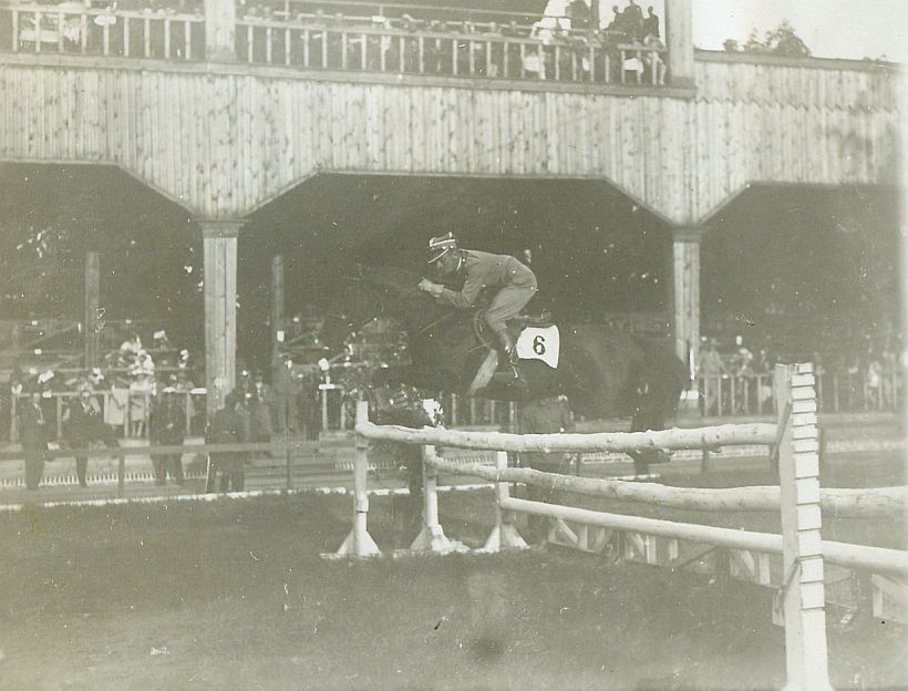 | Nr. inwentarzowy: MŁJ-XVI 1754 / 03 / 011 opis: Krajowe Zawody Konne. Por. Roman Pohorecki w skoku na klaczy Farsa. Na potniku nr 6. Przy przeszkodzie (triple-barre) stoi żołnierz. W tle kryta trybuna z publicznością. Prawdopodobnie konkurs Armii Polskiej im. Marszałka Polski Józefa Piłsudskiego, w którym Pohorecki i Farsa zdobyli II nagrodę.data: konkursy: 14.05.- Otwarcia lub 16.05.- św. Jerzego lub 18.05. - Armii Polskiej im. Marsz. J. Piłsudskiegoczas powstania - daty graniczne: 1932-05-14 - 1932-05-18miejsce: Warszawa, hipodrom w Łazienkachosoby: Por. Roman Pohorecki ur. 1903 r. (14 p.u., wybitny zawodnik okresu przed II wojną światową, instruktor).tworzywo: papier fotograficzny, błyszczącytechnika: odbitka żelatynowo-srebrowa DOP, czarno-białazespół: album rodziny Bohdanowiczówwymiary (wys. x szer.): 87 x 113 [mm] Koń: 1. Farsa, klacz, maść kara - po Jarnicoton i Baśka, hod. J. Gorayski; koń, na którym startował Roman Pohorecki (m.in. w l. 30. XX w. sukcesy na hipodromie w Warszawie)